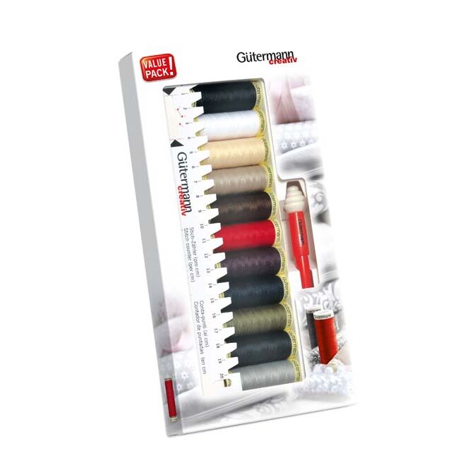 Handige Gütermann naaigaren set met 11 klosjes Allesnaaigaren in basis kleuren. Deze naaigarenset is inclusief zoomlat, seam-fix mini en tornmesje. Een ideale startersset.