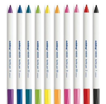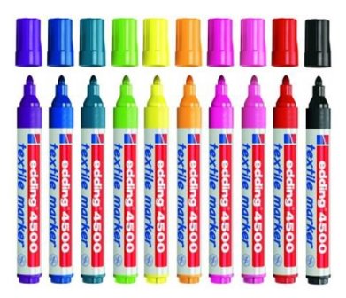 De textielstiften van Edding kun je per set kopen of los. Tevens heeft Edding twee soorten textielstiften. De 4500 serie heeft een wat dikkere punt, dus is fijn voor de grotere letters.