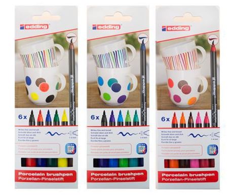 Met de porseleinstiften van Edding kun je je helemaal uitleven op iedere mok. Het werkt heel simpel. Maak de mok stof- en vetvrij, schrijf je tekst op de mok en laat deze 15 minuten drogen. Verwarm de oven voor op 1600 C en plaats de mok 25 minuten in de oven. Laat daarna de mok afkoelen in de oven en hij is klaar voor gebruik.