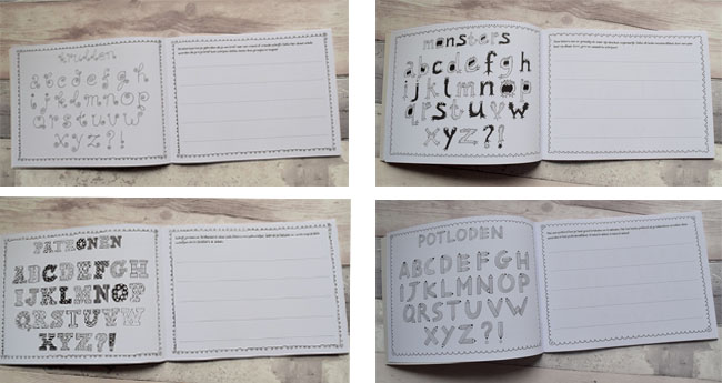Er staan letters met krullen in, monsterletters, letters met verschillende patroontjes, potloodletters en nog veel meer. Zo kunnen de kinderen de letters niet alleen na tekenen op de bladzijde ernaast, maar kunnen ze de voorbeeld-letters ook leuk kleuren.