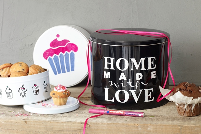 Een ander leuk idee; teken met de Edding Paintmarker 751 een pakkende tekst op een effen kleurige trommel, vul de trommel met heerlijke zelf gebakken koekjes of cupcakes en geef het cadeau. Een betaalbaar en persoonlijk cadeau voor iedere gelegenheid.