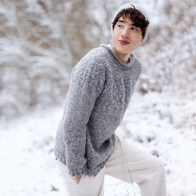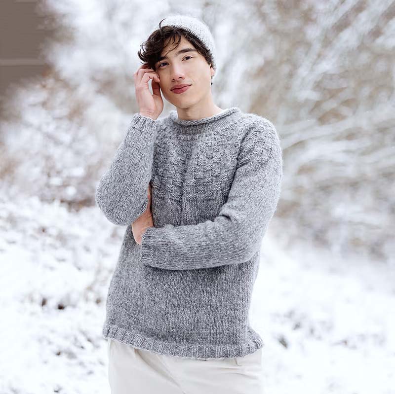 Deze herentrui heeft een blokjes motief in de rondgebreide pas. Het rolboordje bij de hals, samen met de zachte kleur melange, geeft de trui een casual look. Het garen Novita Halaus is een lichgewicht garen wat op een speciale manier wordt vervaardigt. Hierdoor voelt deze herentrui licht en soepel aan. Je breti de trui in het rond, van onder naar boven en voegt de mouwen ter hoogte van de ronde pas toe. Zo krijge je geen naden in de trui en hoef je na het breien alleen nog wat draadjes weg te werken.