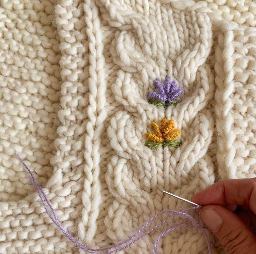 Ben je klaar met breien, dan boorduur je met restjes dun garen of borduurgaren, kleine bloemetjes in het kabelpatroon.