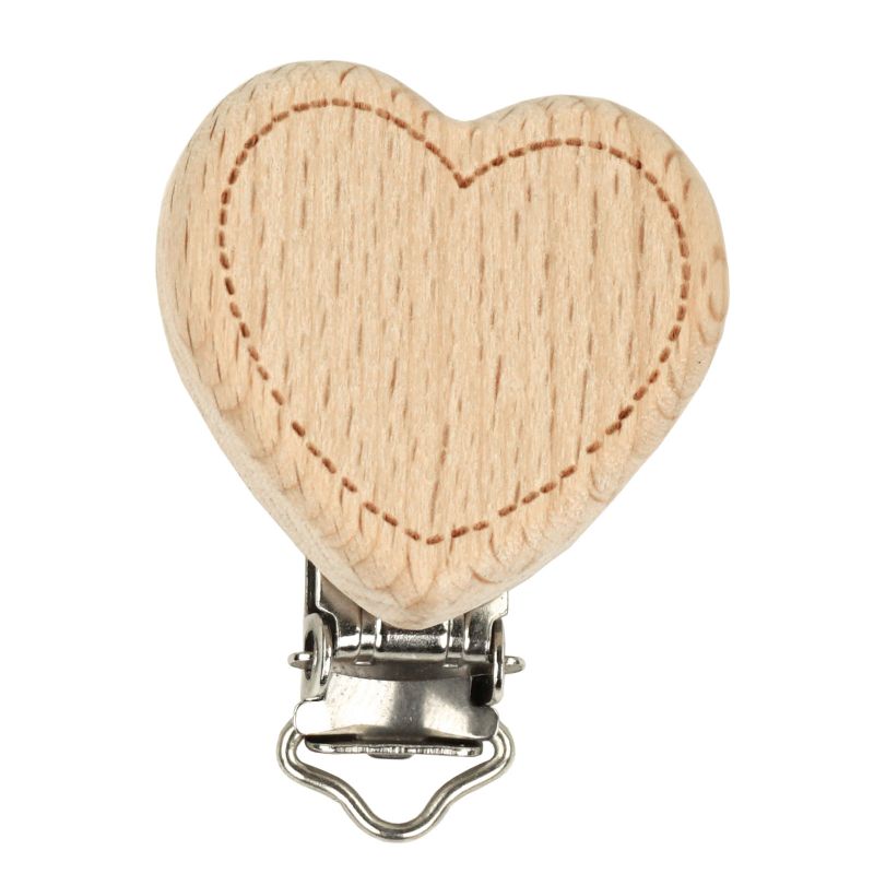 Deze speenclip van hout in de vorm van een hart is geschikt om een speenkoord mee te maken. Maar je kunt de clip ook aan een knuffeldoekje of knuffeltje maken zodat ze altijd binnen handbereik blijven. De houten speenclips zijn verkrijgbaar in diverse vormen of met diverse teksten.