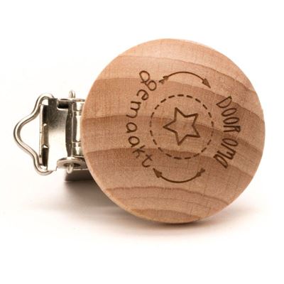 Deze speenclip van hout is bedrukt met de tekst "Door oma gemaakt". Je ontvangt gelijk 2 stuks zodat je een extra speenkoord kunt maken. Maak een koord aan het oog van de speenclip en bevestig de speen, een bijring of rammelaar er aan. De clip maak je vast aan de kleding van de baby of bv de voetenzak van de kinderwagen en zo raak je niks meer kwijt.