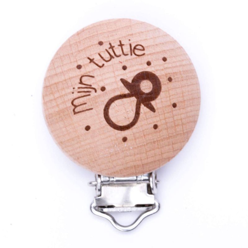- 2 houten speenclips met de tekst "Mijn tuttie"