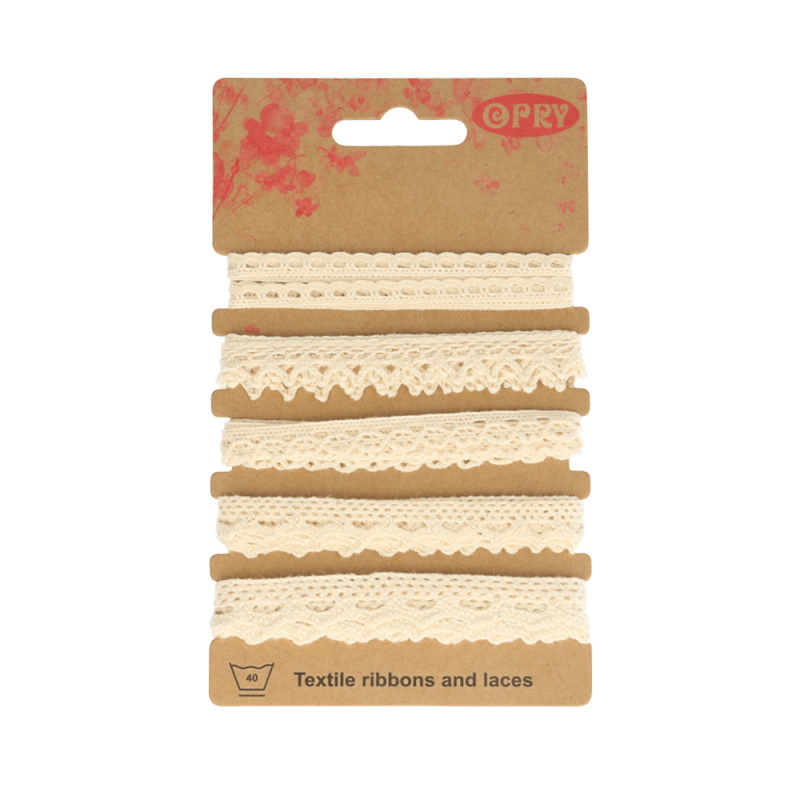 Laat je creativiteit helemaal de vrije loop en knutsel en versier met het kant band van Opry wat jij maar wilt. Opry Kant band is verkrijgbaar op kaartjes met 5 verschillende kanten randjes. Het kant band heeft lengte van ca. 1 meter.