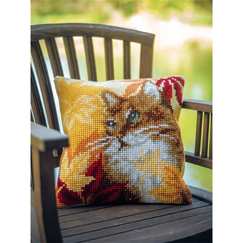 Kat met herfstbladeren borduurkussen - Vervaco borduurpakket
