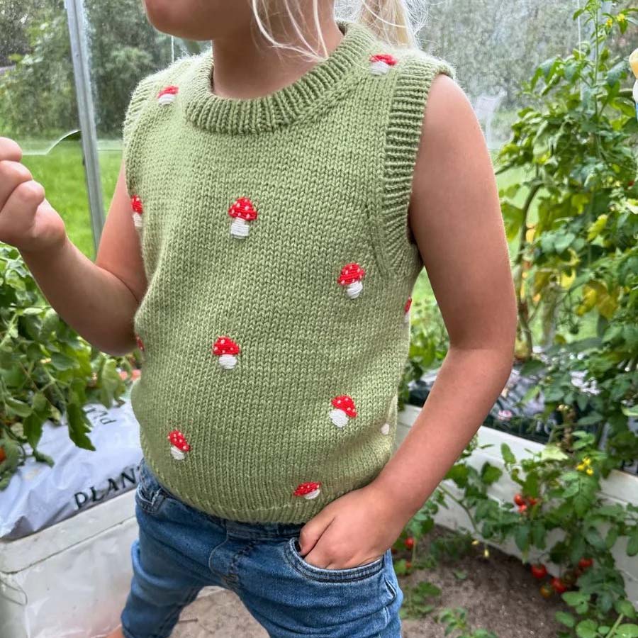 De kinder spencer Novica kun je breien voor kinderen van 1 tot 14 jaar. Hierbij kun je kiezen voor een effen model, óf om er na het breien wat leuks op te borduren. Op de foto's zie je een kinder spencer met bijtjes en één met paddenstoeltjes, maar je kunt er natuurlijk ook iets anders op borduren. Je breit de slipover met het zachte garen Sandnes Garn Peer Gynt op breinaalden 4 mm.