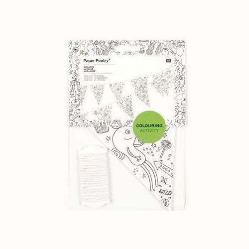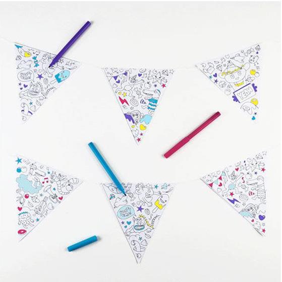 Bij een feestje hoort ook de voorpret, dus kleur samen een speciale slinger. Dat kan met deze leuke vlaggetjes slinger van stevig papier.