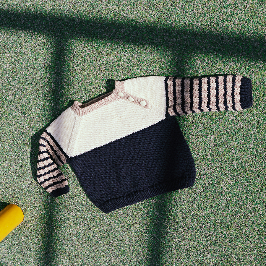Het kindertruitje wordt rondgebreid van onder naar boven.