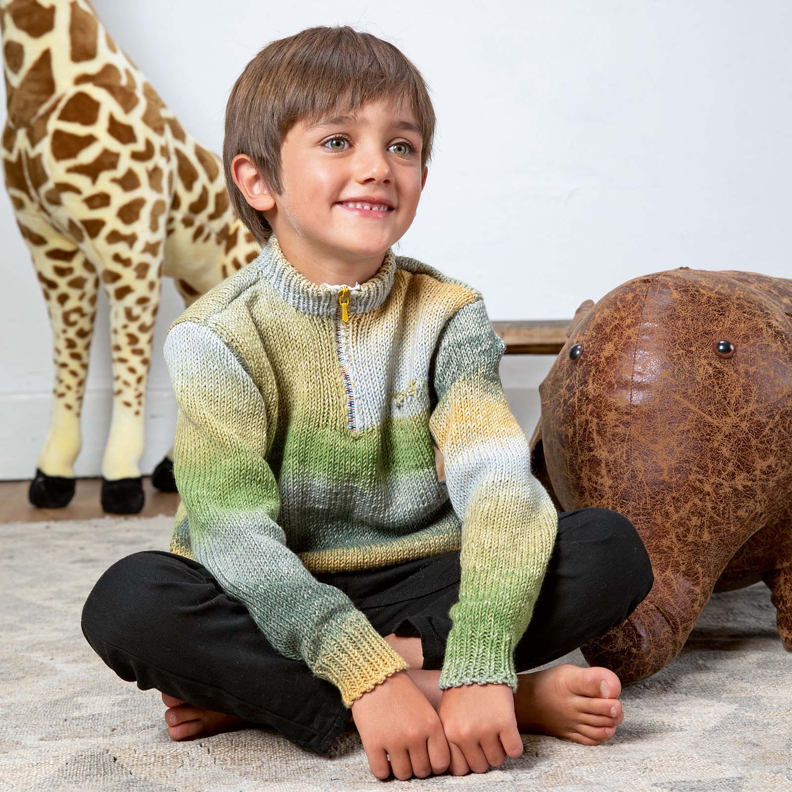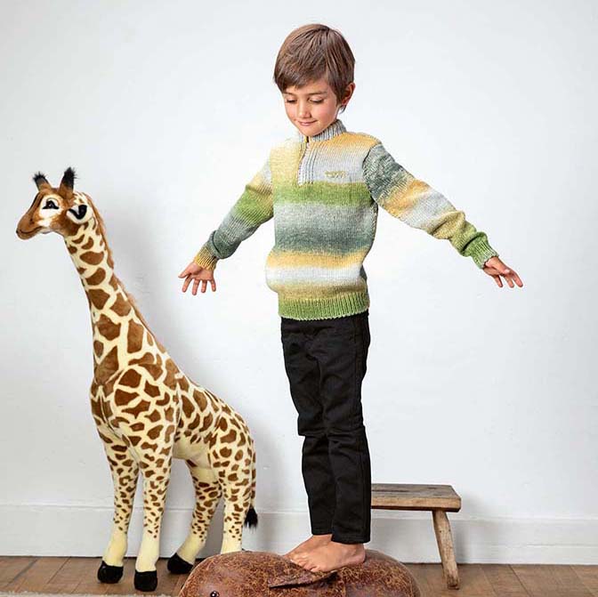 Deze vrolijke kindertrui met rits brei je met het Lang Yarns breipakket. De trui wordt gebreid met een mooi, zacht verloop garen wat tijdens het breien een streep patroon laat verschijnen. Dit model kan voor zowel jongens als meisjes en kan met verschillende kledingstukken gecombineerd worden.