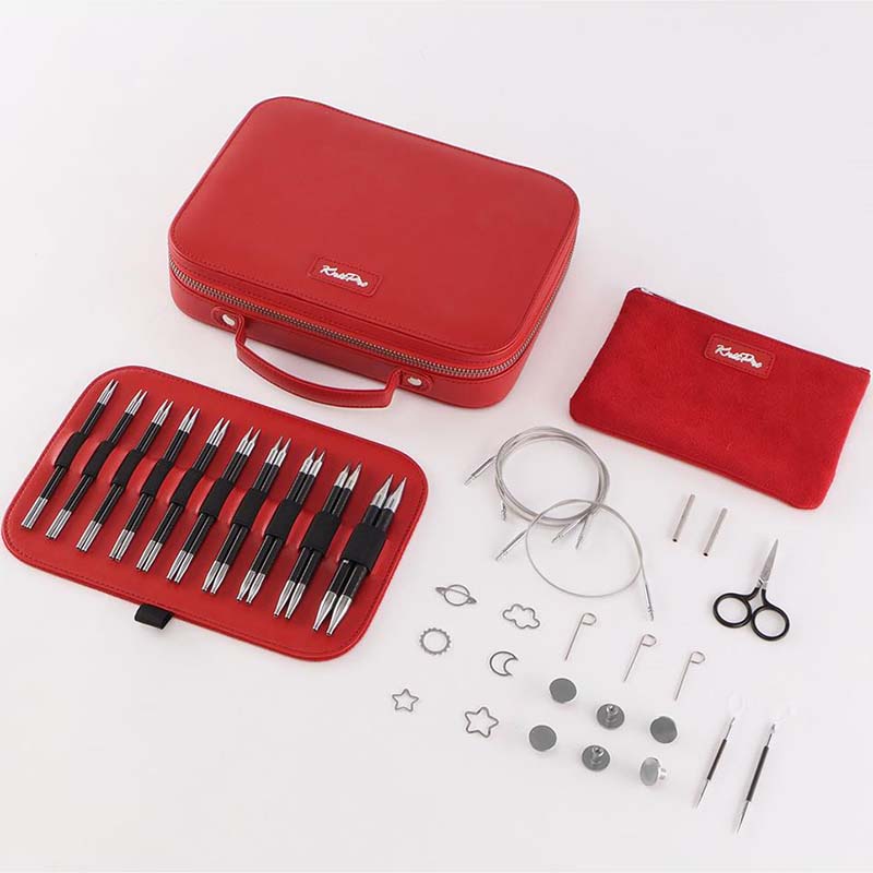 Naast de verwisselbare breipunten ontvang je 4 360° roterende kabels in de maten 60 cm, 80 cm en 100 cm. Ook zitten er nog andere benodigde accessoires in het etui zodat je alles hebt wat je nodig hebt voor een reeks breiprojecten. Dit alles in een luxe rode etui.