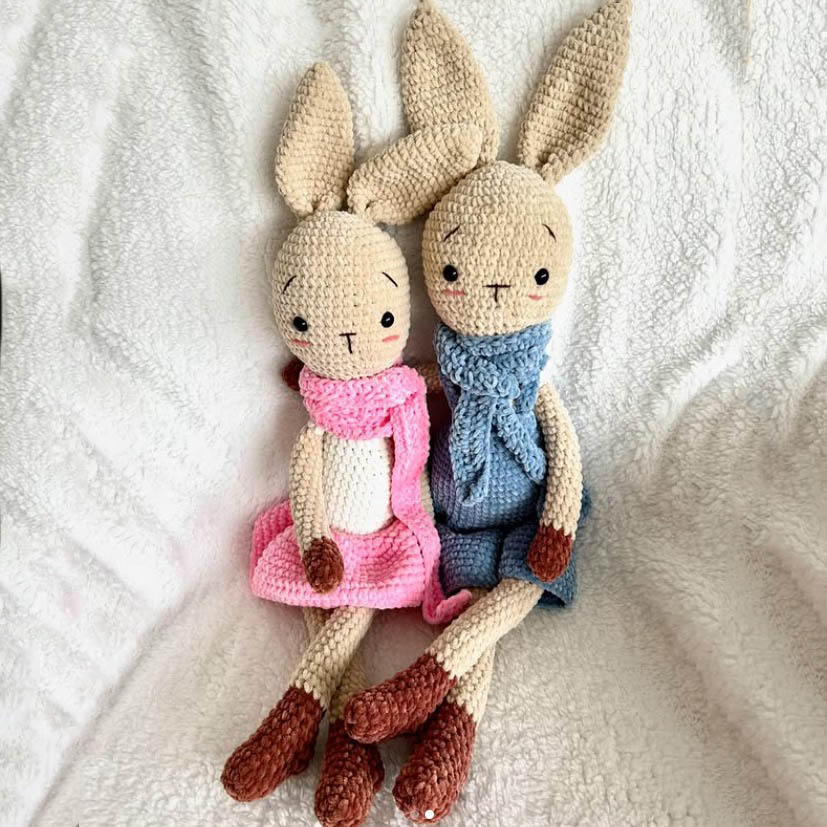 Haak voor de kleintjes deze lieve knuffel konijntjes Finn en Lola. Door het super zachte velvet garen van Durable worden het de fijnste vriendjes om mee te knuffelen en spelen. Finn en Lola worden ca. 50 cm lang.