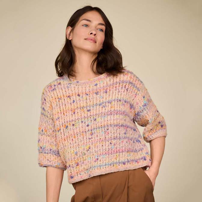 Dit korte mouwen truitje voor dames brei je nu zelf met de honigraatsteek en het lichtgewicht garen Lana Grossa Cassata. Het heeft vrolijk gekleurde stippen waardoor je truitje overal mee combineert. De Honingraatsteek is een afwisselende steek die extra uitstraling aan je ontwerp geeft. Je kunt het korte mouwen truitje ook dragen met een shirt of colletje.