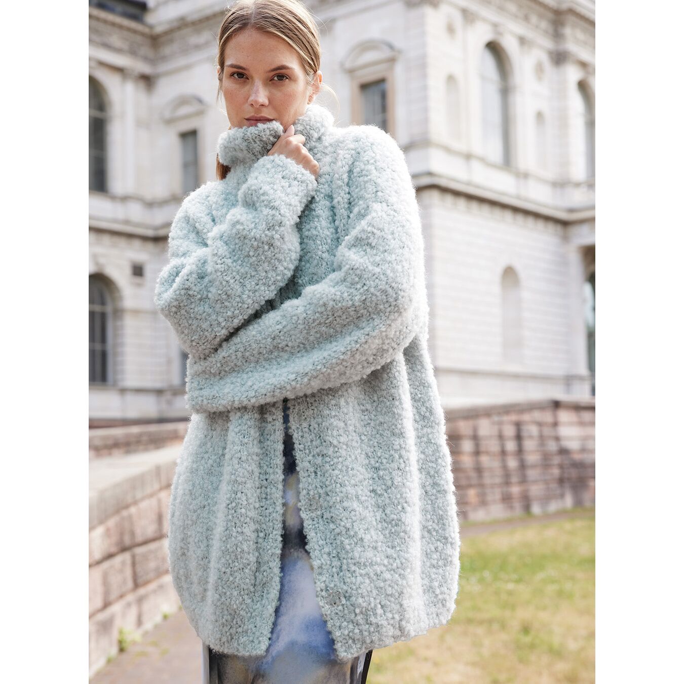 Lang damesvest bouclé breien - Lana Grossa breipakket