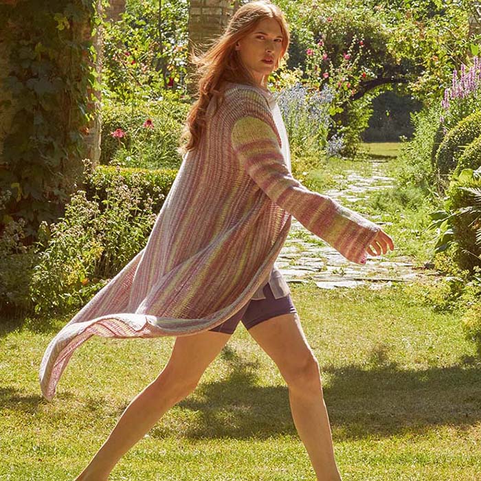 Brei dit mooie lange damesvest Najra met het gekleurde garen Lang Yarns Secret Garden en geniet van de mooi lente dagen. Het graren is een mix van katoen en verkrijgbaar in verschillende kleuren.
