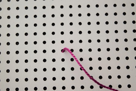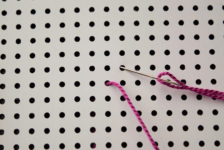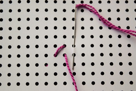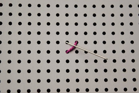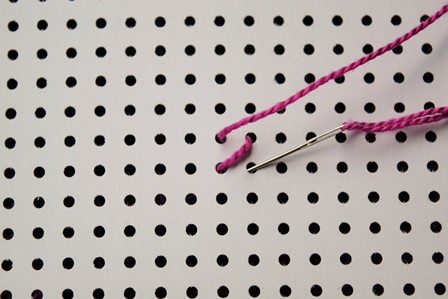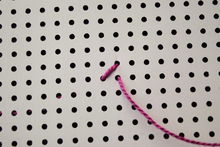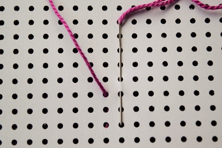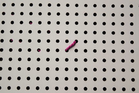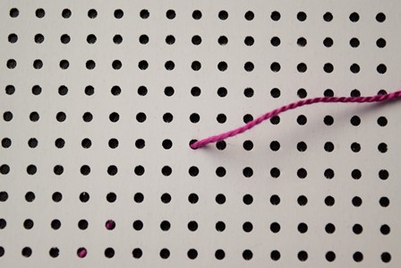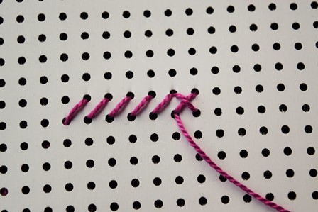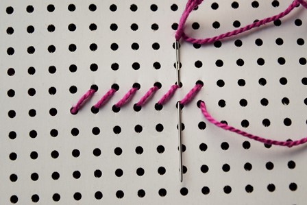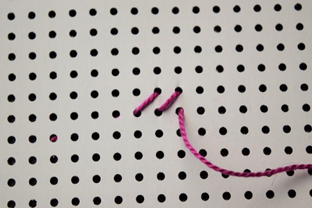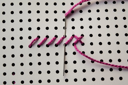 Steek de naald aan de achterkant door de borduurstof, trek de naald en draad naar voren, steek de naald door het gaatje schuin boven het eerste gaatje en trek de naald en draad naar achter door.