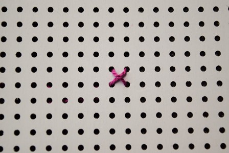 Je ziet dat de kruissteek gebruik maakt van vier openingen. Je verbindt steeds de twee schuin tegenover elkaar liggende openingen met elkaar.