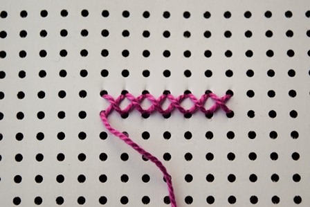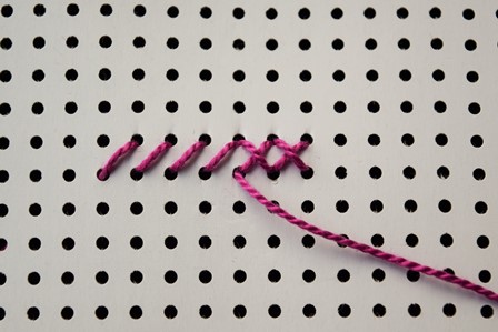 Steek de naald weer schuin boven door het get en recht naar beneden. Trek de naald weer door en de tweede halve kruissteek verschijnt naast de eerste. Borduur zo nog vier halve steken zodat je 6 halve kruisjes krijgt.