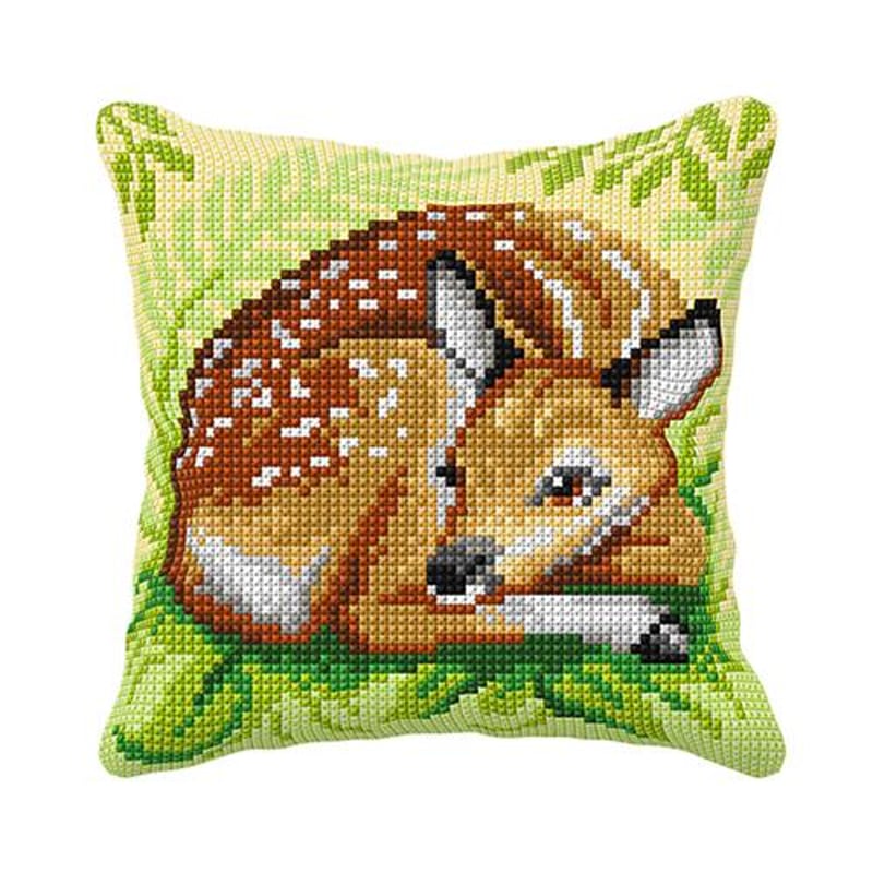 Liggende Ree kussen borduren doe je met dit borduurpakket van Orchidea. Combineer het kussen met andere leuke borduur- of knoopkussens.