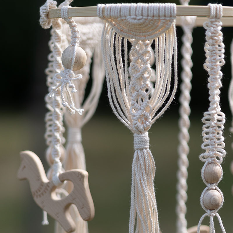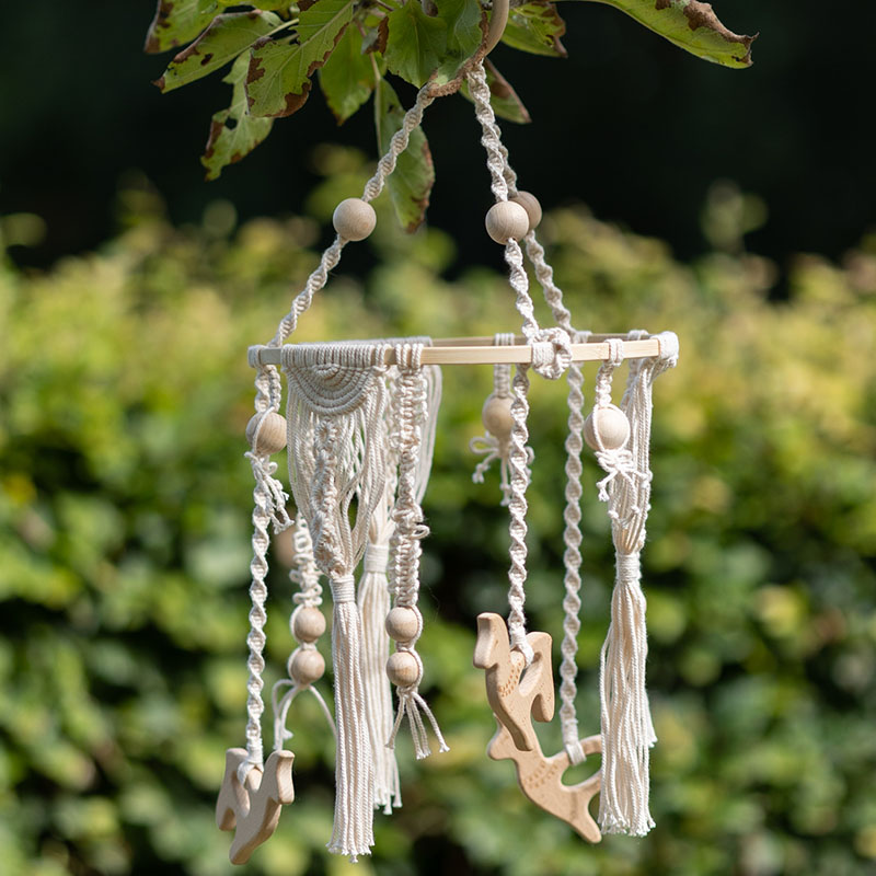 Deze leuke macramé baby mobiel maak je zelf met het FairMade macramé pakket. Het is een klein project waarin verschillende macramé knopen worden gebruikt. Zo leer je met 1 project meerdere technieken van het macrameeën. De baby mobiel wordt aan een bamboe ring gemaakt. Boven in wordt een houten ring gebruikt om het geheel aan op te hangen en de houten Lama's maken deze baby box mobiel helemaal af.