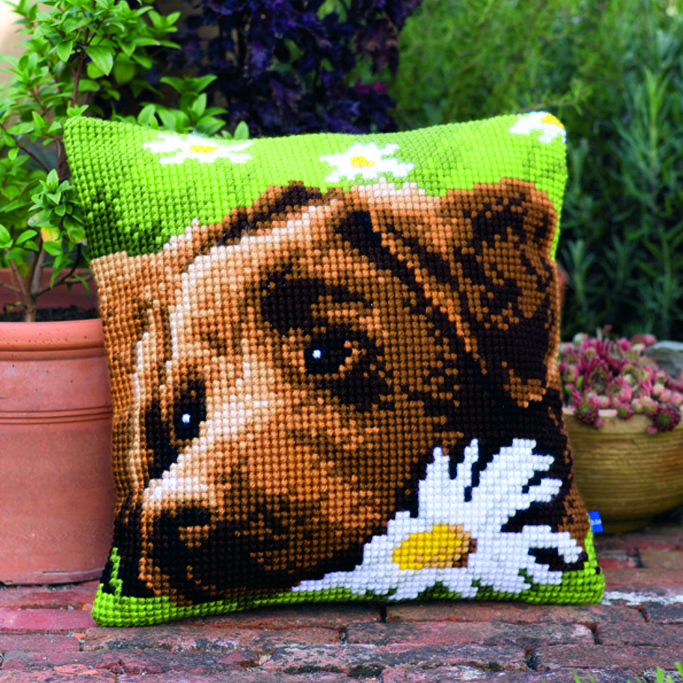 Al onze borduurpakketten die op stramien worden geborduurd, zijn kussens. Je borduurt dan met wollig garen.