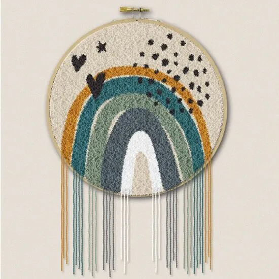 Punchen is een borduur techniek, ook wel bekend als de punch needle techniek. Je gebruikt hiervoor de holle punchnaald waar je draad doorheen loopt. Met deze naald duw je het garen door de stoffen ondergrond. Als je de naald weer naar boven haalt ontstaat er aan de achterkant een klein lusje.