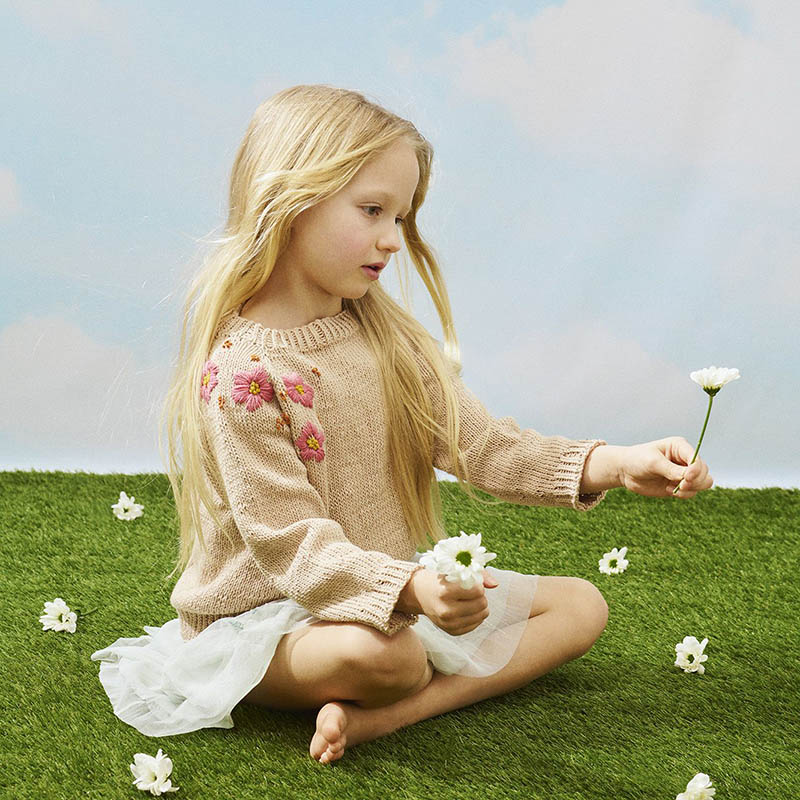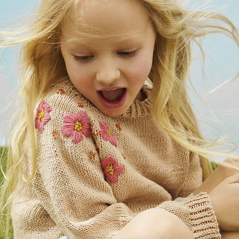 De meisjes trui Hilpa kan het hele jaar door gedragen worden. Door de samenstelling van het garen is de trui niet te warm en toch comfortabel. Op de schouder geven de geborduurde bloemen de kindertrui een vrolijke uitstraling. Door de raglan mouwinzet past de trui perfect en blijft deze ook mooi in model. Het is een top-down model, wat betekend dat je bovenaan begint en onderaan eindigt. Alles wordt rondgebreid waardoor je geen naden hebt. Dat scheelt een hoop afwerking.