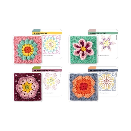 Aan de voorkant van elke kaart staat een foto van de granny square, terwijl de achterkant een duidelijk haakschema toont. De set bevat bovendien een handige handleiding die uitlegt hoe je de schema's leest, hoe je met 3D-bloemen werkt en hoe je de blokken met elkaar verbindt.