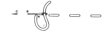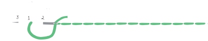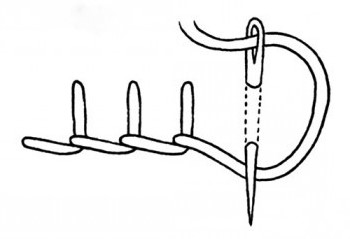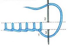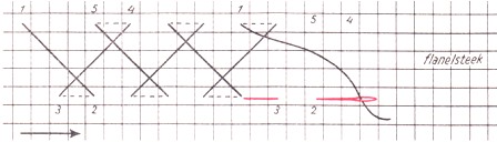 De stik steek maak je door steeds in te steken bij het eind van de vorige steek en weer naar boven te steken een eindje voorbij het eind van de steek die je maakt. In woorden is het moeilijker uit te leggen, daarom een duidelijke afbeelding hieronder.