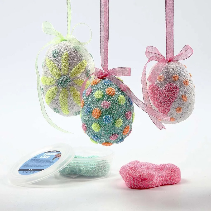 De piepschuim eieren zijn gemaakt van styropor, zijn 8 cm groot en zitten per 5 stuks verpakt. Het is de perfecte ondergrond om mee te knutselen. Je kunt de eieren bewerken met Foam klei, beplakken met papier of met lontwol bekleden doormiddel van naaldvilten. Omdat het materiaal stevig maar luchtig is kun je er makkelijk met een naald en draad doorheen prikken. Zo kun je eenvoudig lusje aan het ei maken om hem op te kunnen hangen.
