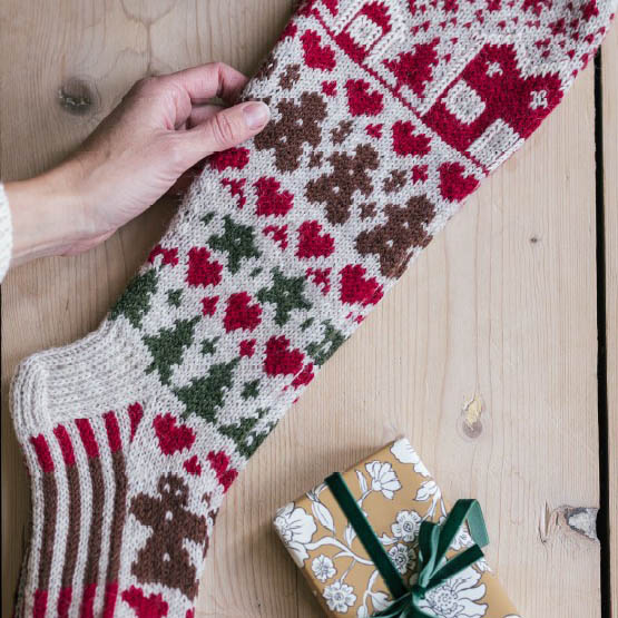 Deze bijzonder kniekousen zijn prachtig om met de Kerst te dragen. De kousen met peperkoekmotief van Sisko Sälpäkivi zijn favoriet voor deze winter. De randen van de peperkoekhuisjes zijn geborduurd met suikerglazuurdecoraties. Indien nodig kun je de bovenkant van de sok verlengen door na de borduursteek wat extra in de basiskleur te breien.