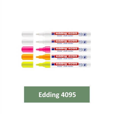 De Edding 4095 krijtmarker is speciaal gemaakt voor het schrijven op glas en kan net als de Edding 90 gemakkelijk worden uitgewist. Deze stift heeft als voordeel dat de kleuren scherp op glas blijven staan, maar ook eenvoudig afgenomen kunnen worden met een vochtige doek. De ronde punt van de stift heeft een schrijfdikte van twee tot drie millimeter en is daarmee ideaal voor het schrijven van tekst op glas. Deze windowmarkers worden veel gebruikt voor het schrijven op ramen en spiegels. De edding 4095 krijtmarker is verkrijgbaar in negen verschillende kleuren, waarvan drie neonkleuren die oplichten onder UV-licht. Ook is de Edding krijtmarker verkrijgbaar met een bijtelpunt van 4 tot 15 mm de Edding 4090 en met een smallere punt van 1 tot 2 millimeter voor het maken van kleinere en gedetailleerdere teksten en tekeningen de Edding 4085.