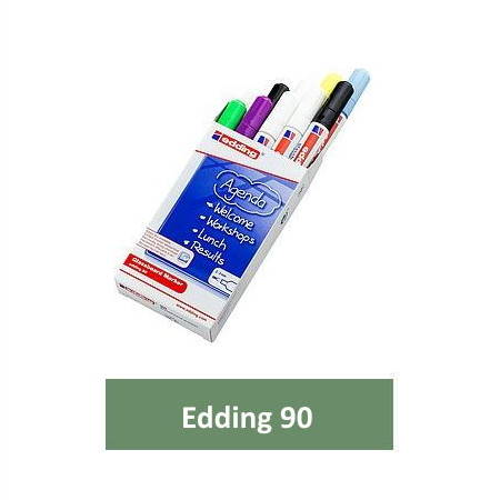 De Edding 90 glassboard marker is ideaal om te schrijven op glas. De inkt kan zonder reinigingsmiddel worden verwijderd en laat geen resten achter. Zelfs na een aantal weken kan de inkt nog makkelijk worden weggeveegd. Je hoeft je met de glassboard marker dus geen zorgen te maken over eventuele schade aan je ramen of glasboard. De stift heeft een ronde punt en een schrijfdikte van twee tot drie millimeter. Ook deze marker werkt volgens de hierboven genoemde pomptechniek. De Edding 90 glassboard marker is verkrijgbaar in zes verschillende mooie kleuren.