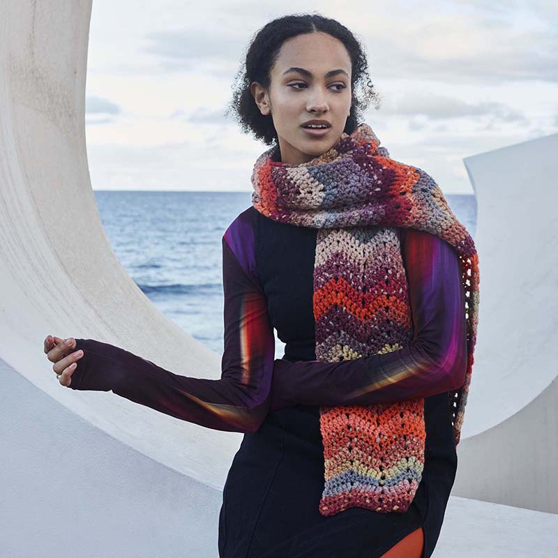 Sjaal Magic is een grove, gehaakte sjaal in een 'zigzag' motief over de breedte. Door het kleurverloop van het garen krijgt de sjaal automatisch een streep patroon. Het is een project wat lekker snel gaat op haaknaald nummer 10. De sjaal ca. 19 x 230 cm