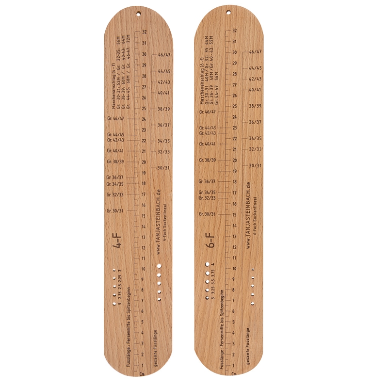 Deze sokken liniaal is een handige accessoire tijdens het sokken breien. Hij is handgemaakt van hout en een mooi design item voor in je collectie! Op de voorkant zijn de maten geschikt voor 4-draads sokkenwol en op de achterkant voor 6-draads sokkenwol.