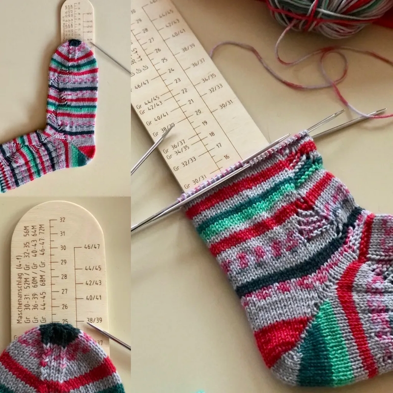 Brei je de sok vanaf de boord, steek dan de sokken liniaal in de hiel en je ziet precies hoe ver je nog moet breien tot je met de minderingen van de teen kan beginnen. Brei je de sok vanaf de teen, steek dan de sokken liniaal in de teen en je ziet precies wanneer je met de hiel kan beginnen.
