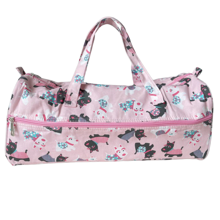 Deze stoffen breitas of haaktas met hondjes print is een handige stevige tas die sluit met een rits. Zo blijft je wol en garen netjes opgeborgen. Je neemt de tas makkelijk mee zodat je overal kunt haken en breien. De tas is voorzien van een handig zijvak voor het opbergen van je kleine handwerkaccessoires. Daarbij heeft deze vrolijke tas ook een handig doorvoergaatje voor je draad waarmee je breit of haakt.