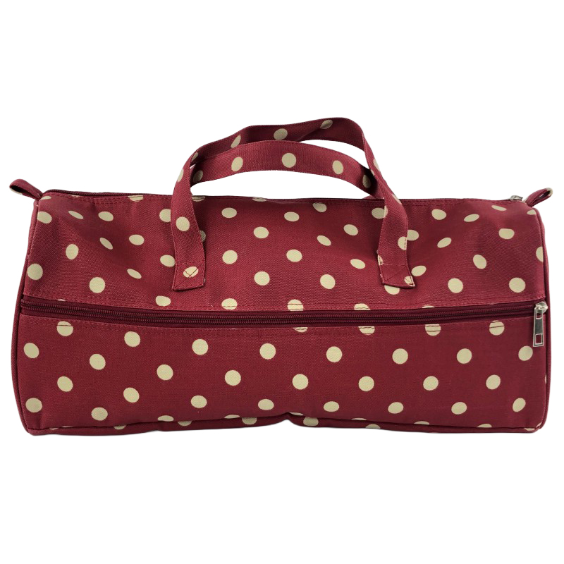 Deze stoffen breitas of haaktas met polkadots print is een handige stevige tas die sluit met een rits. Zo blijft je wol en garen netjes opgeborgen. Je neemt de tas makkelijk mee zodat je overal kunt haken en breien. De tas is voorzien van een handig zijvak voor het opbergen van je kleine handwerkaccessoires. Daarbij heeft deze vrolijke tas ook een handig doorvoergaatje voor je draad waarmee je breit of haakt.