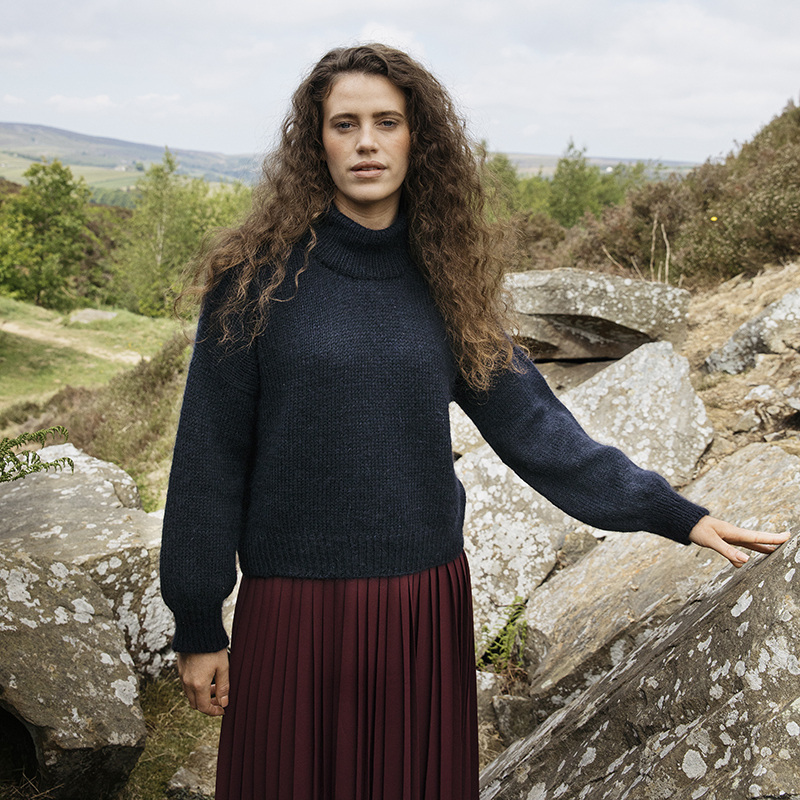 Damestrui Stormfell is een basic, licht oversized model met een hoge boord. Deze hoge boord zit losser en is lager dan een echte col, maar houdt je nek en hals wel lekker warm. Het model heeft afhangende schouders en wordt naadloos, van boven naar beneden gebreid. Omdat het een eenvoudige trui is, is dit een perfect project om te leren hoe je een trui top-down op rondbreinaalden te maakt.