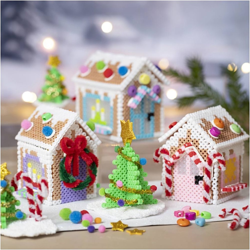 In plaats van een traditioneel peperkoekhuis maak je duurzame en kleurrijke huisjes van strijkkralen. Versier ze met pompons, glitters of sterren en plaats ze op een witte foam ondergrond voor een winters effect. Voeg kleine lichtjes of figuurtjes toe en creëer een magisch tafereel vol kerstvreugde.