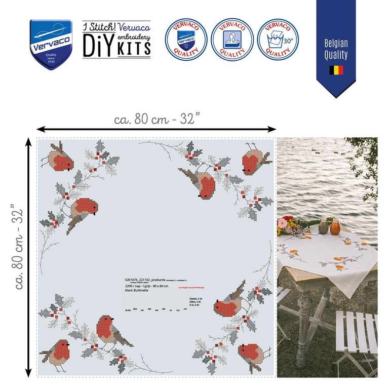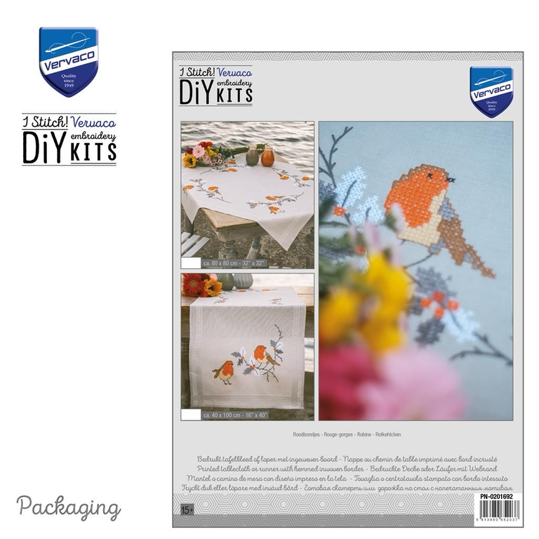 Met het borduurpakket "Roodborstjes" van Vervaco borduur je een sfeervol tafelkleed dat warmte en gezelligheid brengt in huis. De roodborstjes zorgen voor een klassieke, landelijke uitstraling en maken dit tafelkleed perfect voor de herfst en wintermaanden, maar ook mooi als tijdloos accent op tafel.