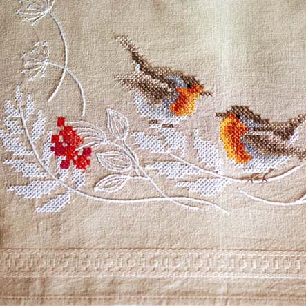 Inhoud borduurpakket tafelloper roodborstjes in de winter: