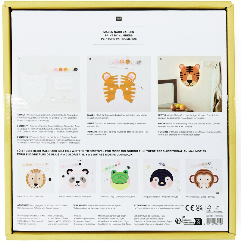 Het Rico Design schilderen op nummer is een leuke activiteit voor kinderen. Op het canvasdoek staan gekleurde motieflijnen, waardoor kinderen precies zien waar elke kleur hoort. Door alle vakken in te schilderen ontstaat een vrolijk schilderij van een tijger. Het penseel is ontworpen met een comfortabele geleider, zodat er makkelijk mee te schilderen is.