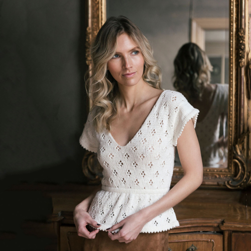 Het Tuomi zomertopje breien met het Novita Woolly Wood breipakket is bijzonder leuk door het eenvoudige ajourpatroon en het model wat net even anders is dan anders. Zowel aan de voor- als aan de achterkant heeft deze zomertop een V-hals. Het kapmouwtje en ingebreide taille benadrukt de romantische stijl. Dit topje is niet alleen prachtig om te zien, maar ook een uitdaging om te maken. Hiermee leer je meerdere nieuwe technieken van breien.