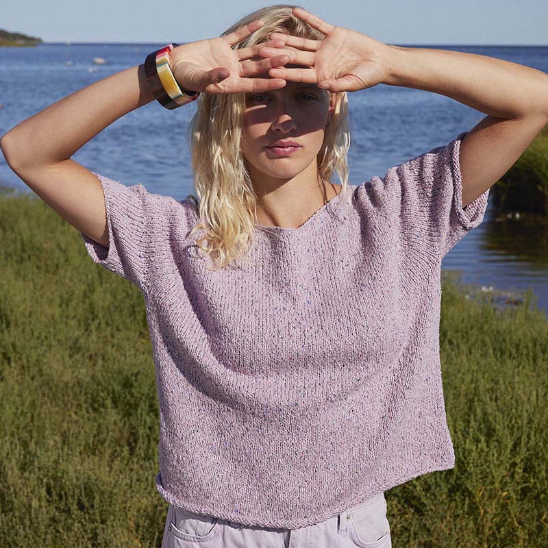 Het zomershirt Christine brei je met het vrolijke tweed garen Lang Yarns Cotton Tweed. Een mix van katoen met zijde. In het garen zitten kleine gekleurde plukjes zijde verwerkt. Dit geeft deze zomertop een vrolijke twist. Door de raglan mouwinzet heeft het shirt een perfecte pasvorm.