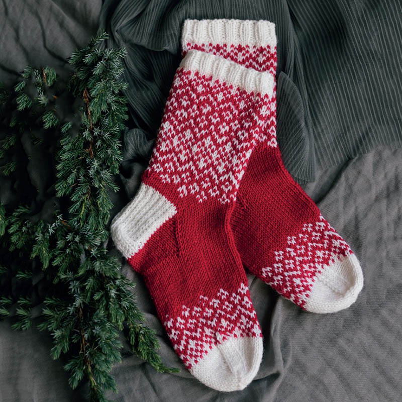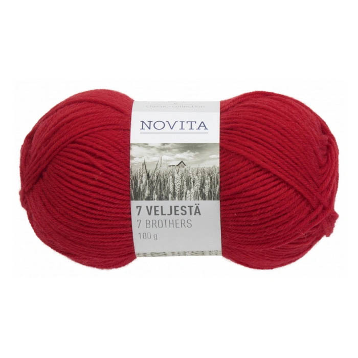 De sokken op de foto zijn gebreid met kleur 11 (wit) en kleur 549 (rood). Wil je graag een andere kleurcombinatie? Klik dan op Novita 7 Veljestä, kies je kleuren en geef de kleurnummers door in het opmerkingen vak aan het eind van je bestelling.