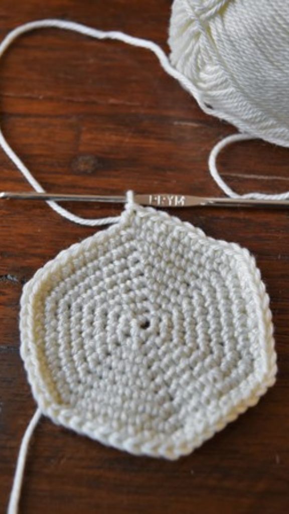 Haak dan 6 v en steek daarbij steeds door het midden van de ring.