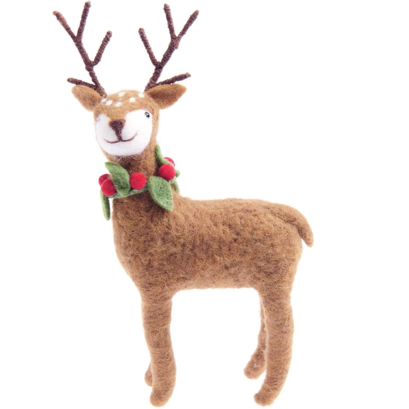 Dit handgevilte hert in een warme bruintint is versierd met een feestelijke hulstkrans en brengt direct winterse charme in huis. De zorgvuldige details en zachte viltstructuur maken het een sfeervolle blikvanger voor in de kerstboom, op een decoratieve schaal of als onderdeel van een winters tafereel.